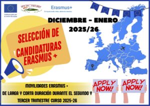 - Selección de alumnado ERASMUS+ 2025-26Adjuntamos documento con las actividades propuestas para la selección de alumnado para participar en las movilidades de larga y corta duración para el segundo y tercer trimestre del curso 2025-26.